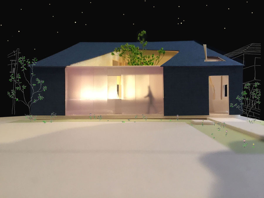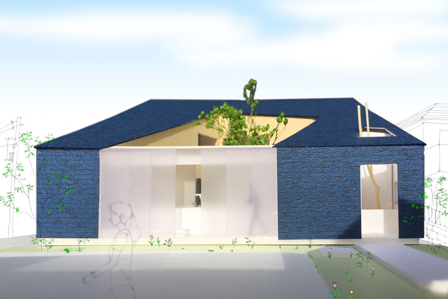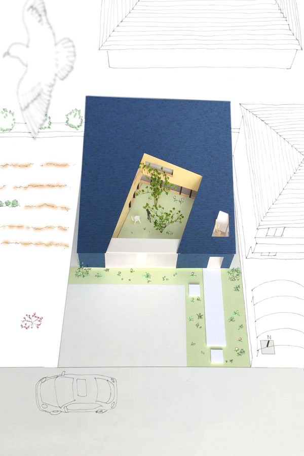 シンプルな形状をそのまま外観に活すために、外装をアスファルトシングルとし、屋根と外壁を1体的に形成し、よりシンプルな表現とした。また、この方位軸に合わせてくりぬいた壁を木貼りとし、中庭をつくることで、家に求心性を生み、家のどこにいても、この方位軸の中庭が印象的になるようにした。これにより、この家に参加しているという意識を無意識につくり、最小単位級の家族の寂しさを和らげるべく、いつでも家族と繋がっているという安心感をえられる家にした。