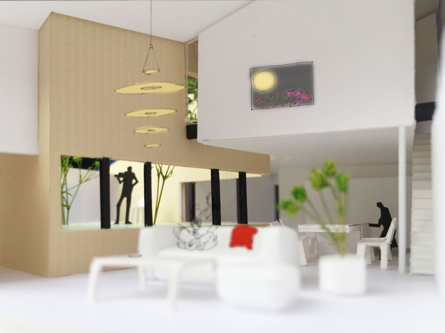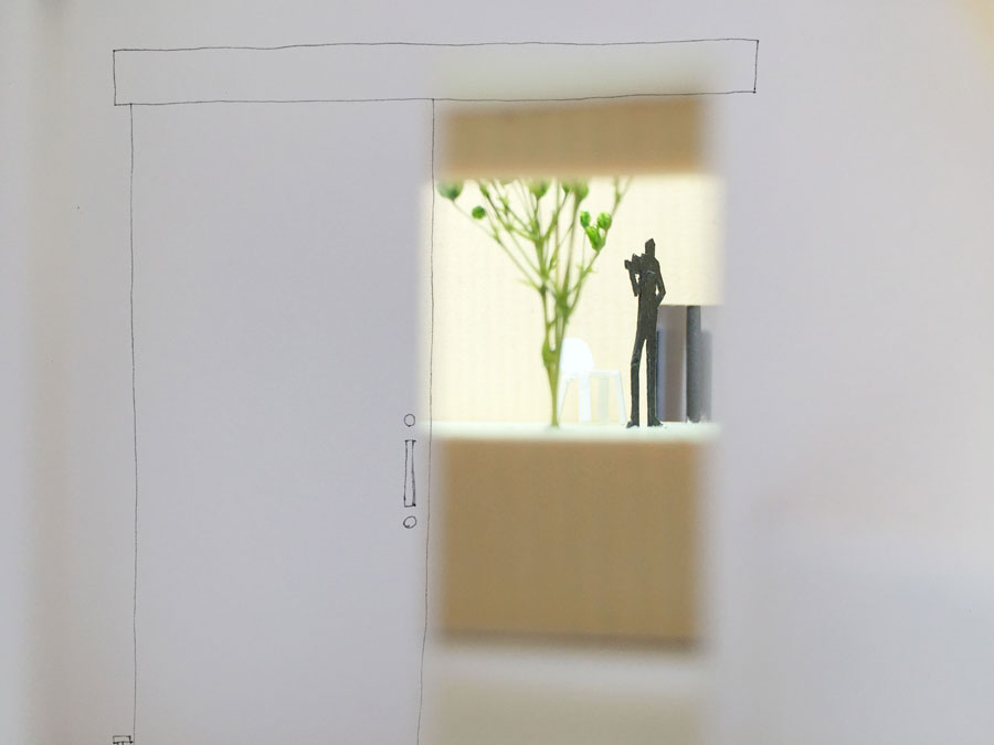 要望をてがかりに、まずは敷地に車3台分のスペースを確保すると、建物を建築できるスペースがほぼ正方形となった。敷地軸に対してできた正方形に、方位軸に合わせた長方形を重ねてくりぬき、道路に対して角度を振った中庭を設け、プライバシー性を確保するコートハウスとした。コートハウスにすると、街に対して壁を設けたように閉ざしきった印象となるため、南側の通路をガラス貼りとし、このガラスに、フィルムで濃淡のグラデーションを与えた。こうすることで、プライベート空間ーパブリック空間という、反対にあるものの境界をぼかして滑らかに繋がっていくようにし、街との均衝を図った。また、夜になれば、リビングからの明かりが行灯のようにガラスを灯し、人の気配が街にこぼれていく。