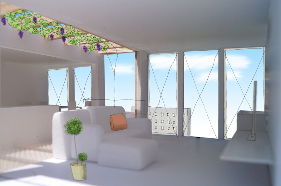 敷地は、東京都世田谷区のアップダウンの激しい地域の一角にあり、北と南に接道している。本敷地の初見で、北側道路から4m高くなっている敷地を生かし、眺望をとろうと考えた。建築基準法で定められた用途地域が、第1種低層住居地域ということで、軒の高さ7m、最高高さ10mまでという なんとも高さの取りづらい地域であり、さらに第1種高度地区という北側の隣地境界線からの斜線制限もかかってくる敷地であることから、建物の1階部分を1mほど地中に埋め、建物の最高高さを抑える計画とした。こうすることにより、建物を3層とすることが可能となるため、見晴らしのいい3階にリビングを設け、玄関や水回りを2階、プライベートな寝室を1階に設け、各々の階層にあった計画とした。