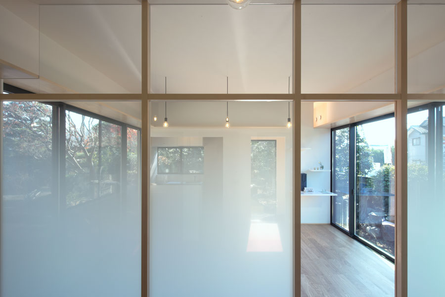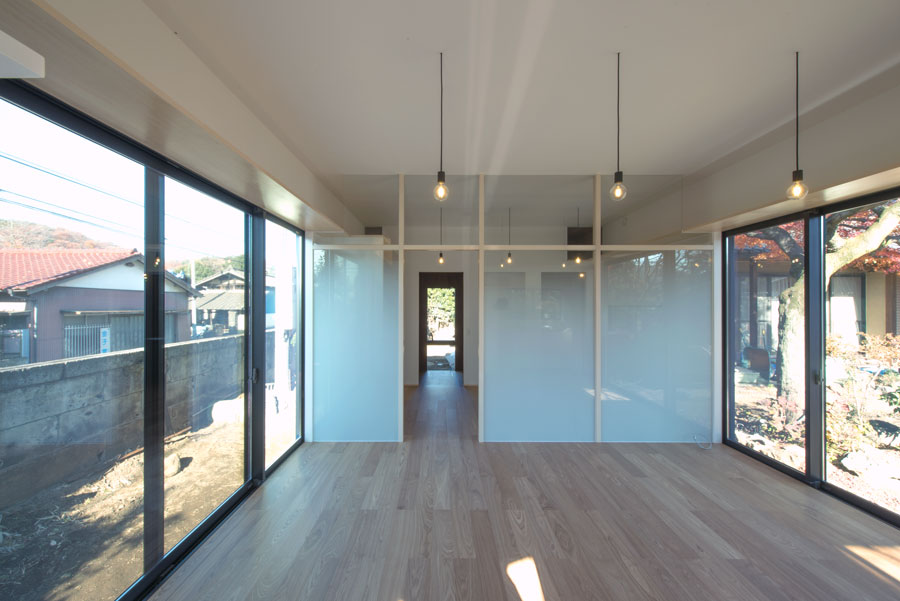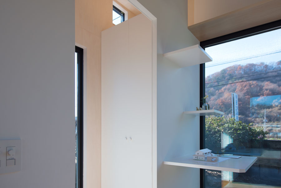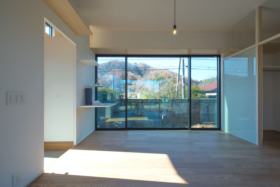 ご夫婦だけのプライベートスペース。道路側から2m50cm離して建物を建てることによって、ご夫婦だけのくつろぎ場所になる(道路側が1mくらい下がっており塀を足すと2m近くなるため自動車の存在が消える)。将来的にウッドデッキを設けるため、東側の共有スペースと西側のプライベートスペースをつなぐリビングになり、東西のウッドデッキによって、室内の視覚的広がりも生まれる。また、奥に見える小高い落葉樹の山が四季を伝えながら、西日を遮り生活に豊かさを与える。普段見えている当たり前の景色を、大きな窓で切り取ってみることで印象的になるよう操作した。