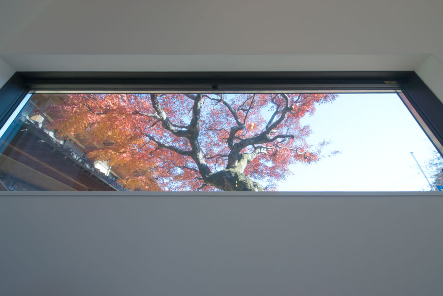 ご夫婦以外の家族や来客との繋がりを生むアクティブな共有スペース。将来的にウッドデッキを設け、ここでみんなと楽しむ。大きな掃き出しの開口を設け意識を促進する。本建物のシンボルツリーとなるヤマモミジがリビングから見え、季節の移ろいを眺めながら豊かに暮らす。