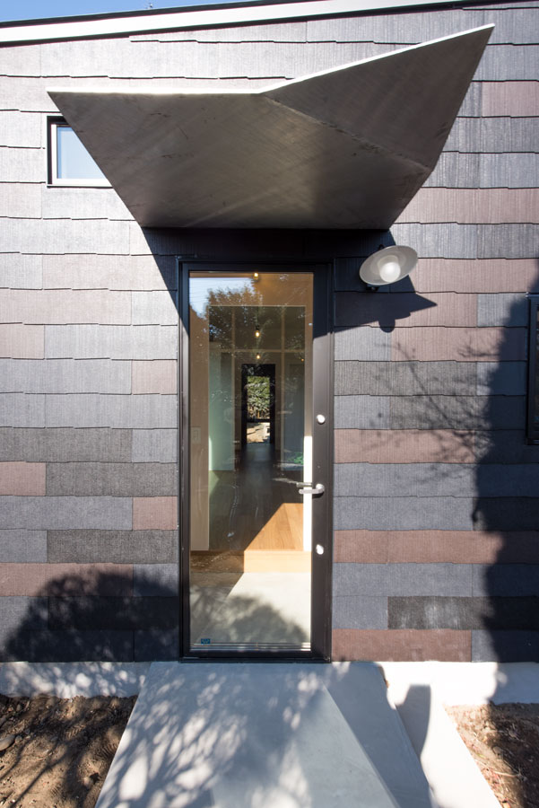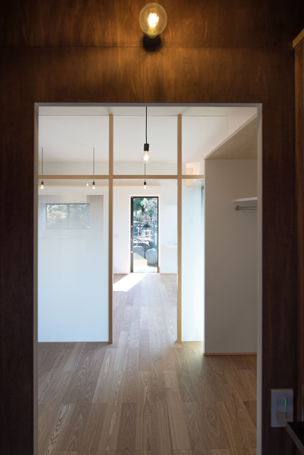玄関からの抜け感を生む庭スペース。100坪もある大きな母屋にとってはただの空地となっていたスペースであるが、本建物の10坪のスケールからは立派な庭になると考え、抜け感を生むための庭として考えた。南北に細長い造りを利用し、それぞれの部屋に同じ大きさ、同じ位置に開口を設けることによって、遠近効果を生み出し、玄関からより北の庭に意識が抜けるように操作した。