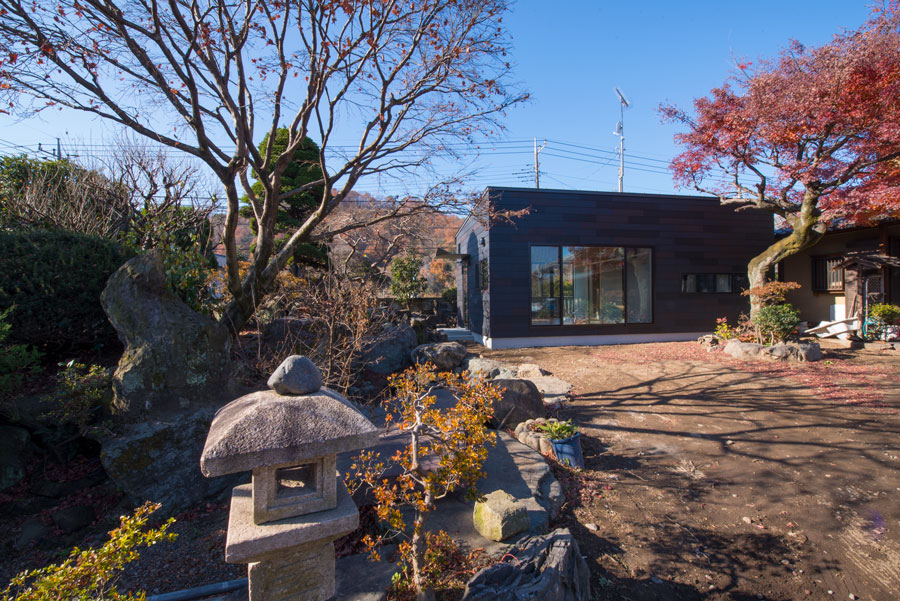 広い敷地の中には建主さんが手をかける樹木の庭園が広がっており、本建物は初めからこの場所という位置が決まっていたので、そこからみえるもの、感じることを手がかりに計画を進めていった。予定場所の中心に立って周りを見渡すと、北東に母屋、東にヤマモミジと空地、南に庭園、西に1mくらい下がって道路がありその奥に小高い山があった。それぞれの方角に性質の違う個性があるので、本建物はそのつながりを整理していく役目を担うことによって、この場所に建つ力強さのような関係性が生まれると考え計画した。